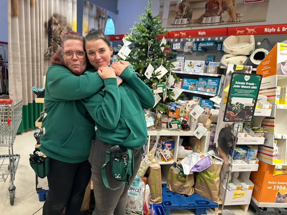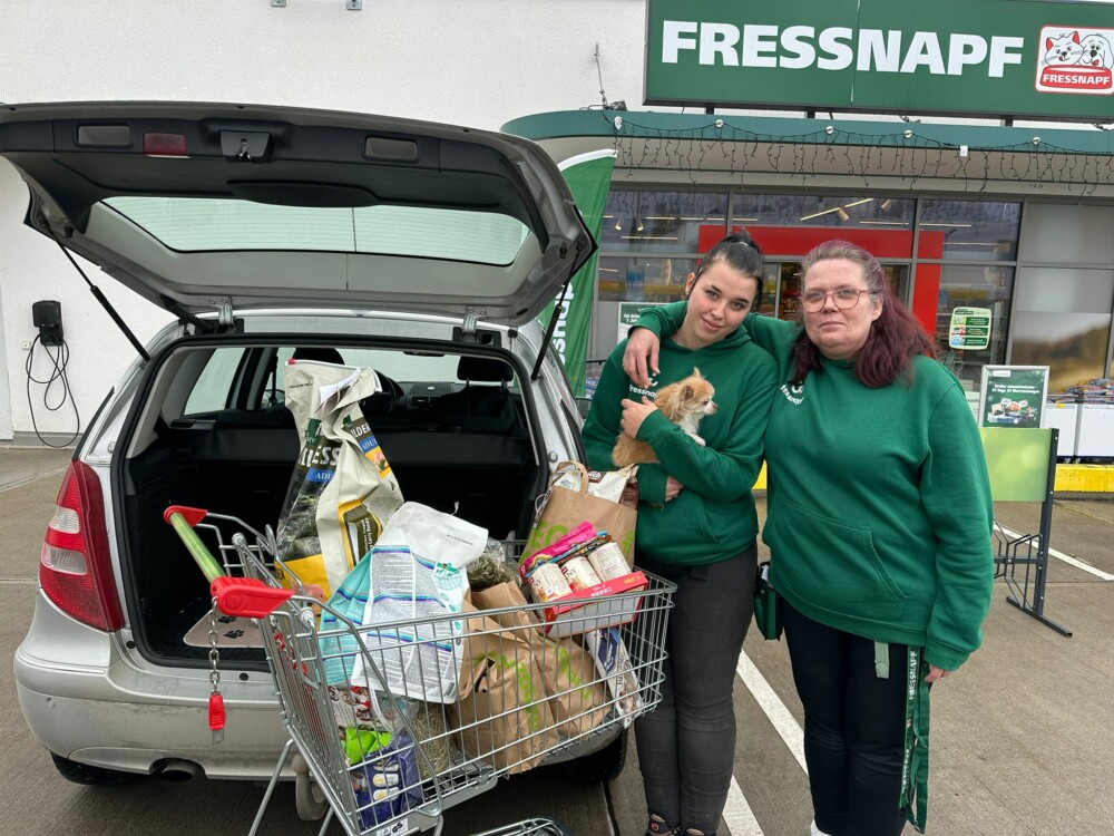 Ganz viele Geschenke für unsere Tiere konnten wir beim Fressnapf Sulzbach-Rosenberg abholen. Wir danken den Mitarbeitern und den tierlieben Kunden, die bereit waren, dringend benötigte Dinge zu kaufen und dann zu spenden. Patenhund Puppi, der sein Pflegefrauchen begleiten durfte, wird bei der Gelegenheit von einer Mitarbeiterin geherzt.