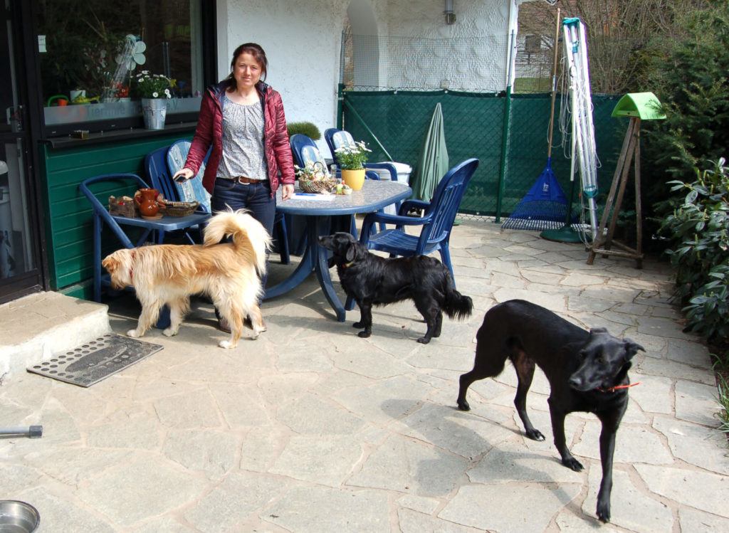 Cona, Lundi und Twigsi mit Frau Zitzmann auf der Terrasse.