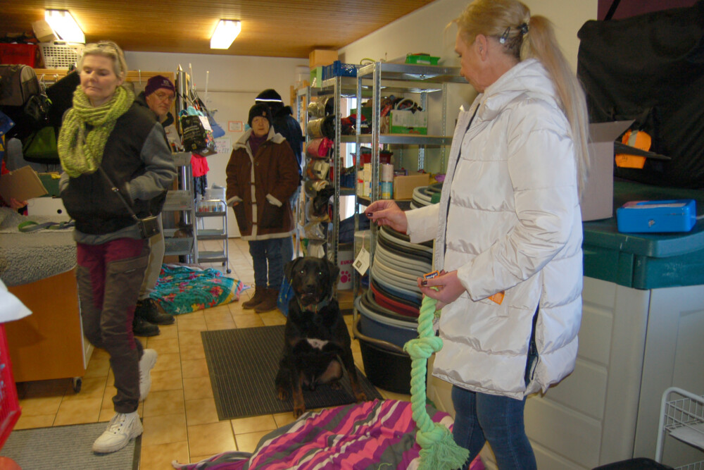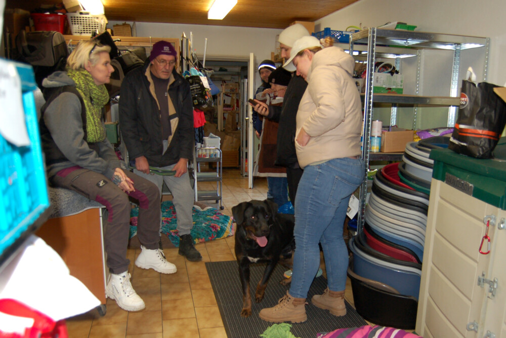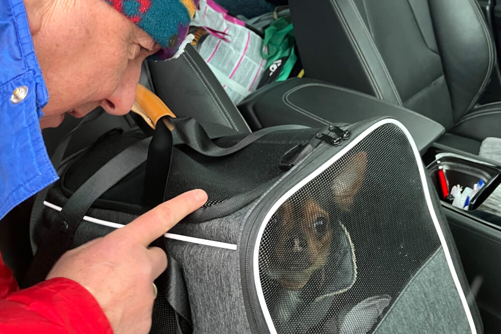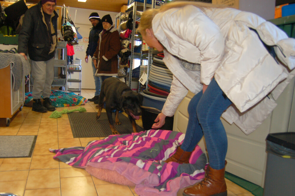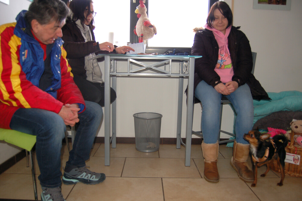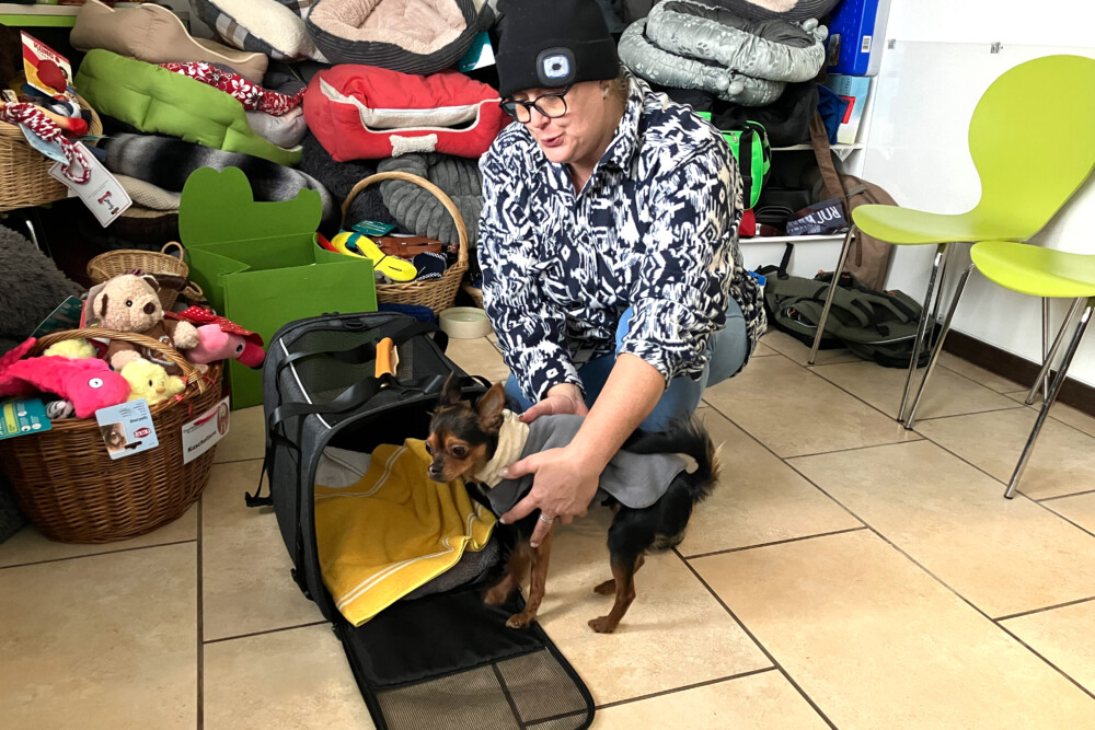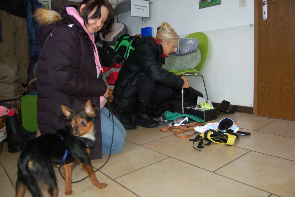 Frau Schimmer macht ihn fertig für den Transport zur Pflegefamilie, den Herr Baur vornimmt.