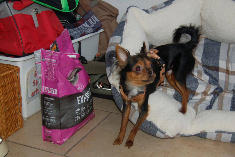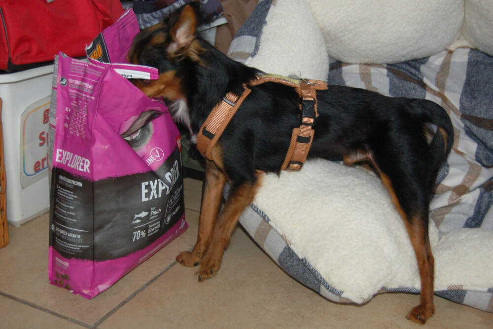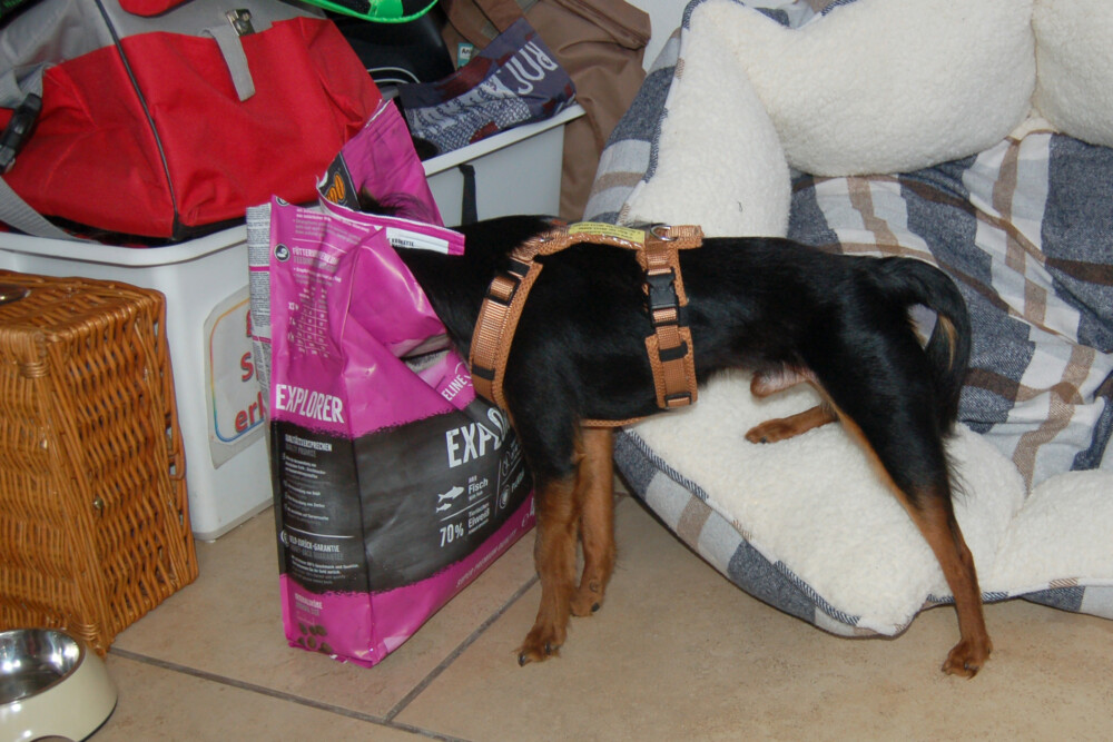 Eine Schüssel braucht Jupi nicht. Kopf in den Sack und los geht’s…