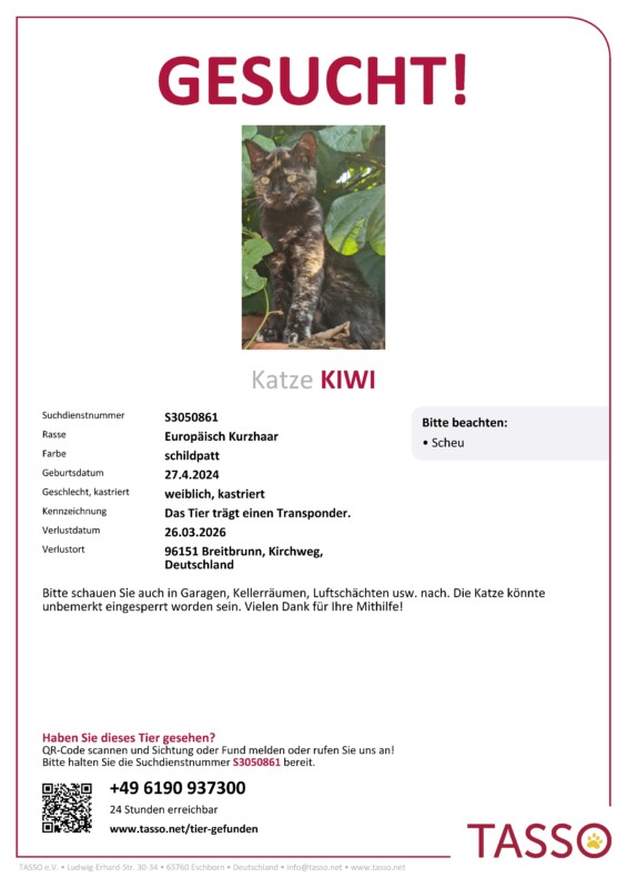 Eine weitere Katze aus unserer Nachbarschaft, eine Schildplatt-Katze namens Kiwi, fehlt auch – eine Nacht bevor Raphi verschwand. Auch sie ist registriert, gechipt und bei Tasso als vermisst gemeldet. Auch sie ist immer nur stundenweise weg. Seit letzter Woche fehlt von beiden jede Spur – sie sind über Nacht verschwunden.