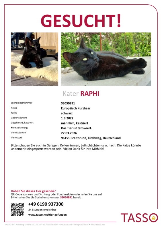 Er ist schwarz, schlank, hat grüne Augen und ein paar vereinzelte weiße Haare im Halsbereich. Er ist nie länger als ein paar Stunden weg. Raphi ist tätowiert, registriert bei Tasso und bereits als vermisst gemeldet.