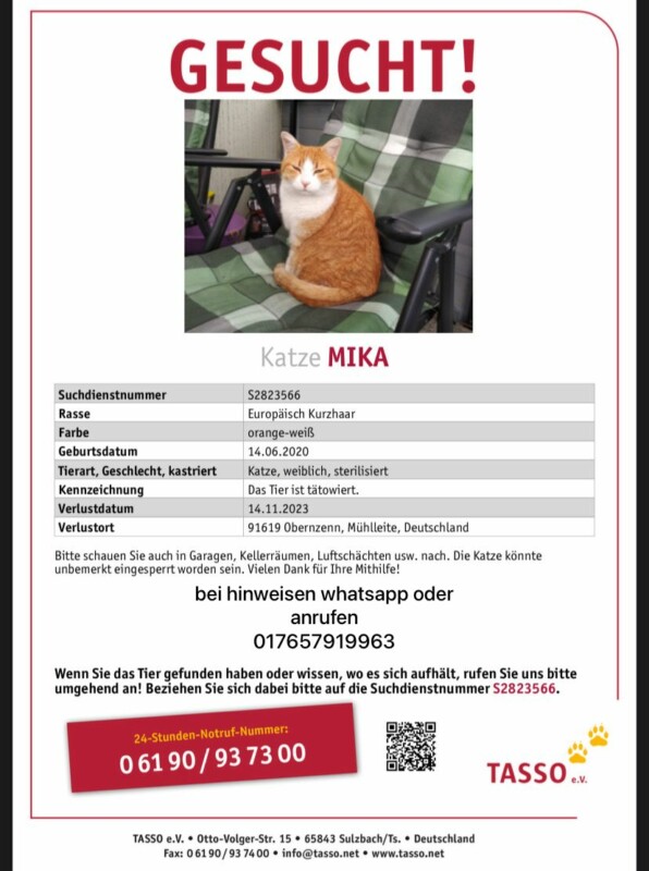 Bis heute habe ich Mika nicht gefunden und keinen einzigen Hinweis bekommen. Keiner hat die Katze gesehen.