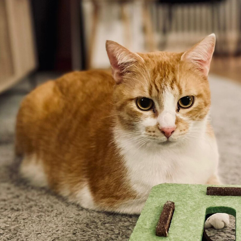 Pixi ist ein toller Kater mit wunderschön gezeichnetem Fell und, wie unschwer zu erkennen ist, kein Kostverächter. Aber das bedeutet nicht, dass er ein „fauler Sack“ ist – nein, er ist neugierig und immer zu einem Spielchen bereit. Allerdings muss er, wie seine Schwester Bella, erst mal die Lage im neuen Zuhause sondieren.