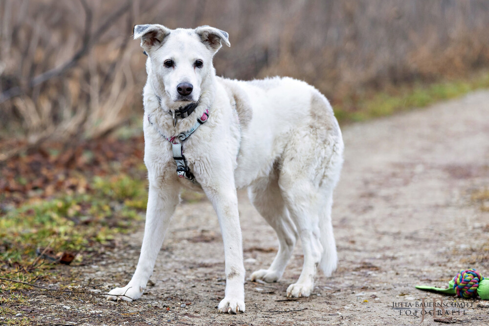 Die zauberhafte Seniorin kommt gut mit Artgenossen zurecht und hat Zeit ihres Lebens mit einer anderen Hündin zusammen gelebt. Zudem fährt sie brav im Auto mit und kann nach Eingewöhnung problemlos ein paar Stunden alleine bleiben. Bei Fremden ist sie am Anfang etwas schüchtern, wenn sie Vertrauen gefasst hat, ist sie sehr anhänglich und verschmust. Linny ist eine unkomplizierte, nette Hündin, die brav an der Leine läuft.