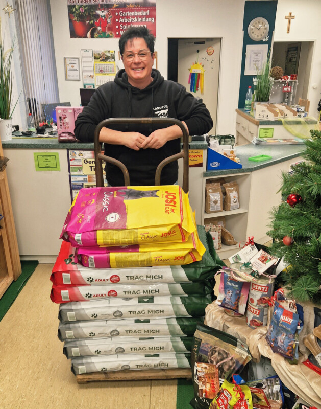 Unsere Helferin, Sabine Haberzettl, besuchte Ladfuxx-Regn in Auerbach, um die Geschenke aus der “Wünsch-Dir-Was”-Weihnachtsbaumaktion entgegen zu nehmen. Zusätzlich zu den Spenden der Kundinnen und Kunden spendete die Chefin einige große Säcke wertvolles Hunde- und Katzenfuttert, das ebenfalls direkt den Tieren zugute kommt.